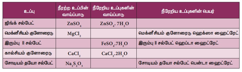 படிகநீர் கருத்தை அடிப்படையாகக் கொண்டு கீழ்க்கண்ட அட்டவணையை