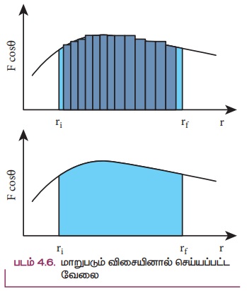 மாறுபடும் விசையினால் செய்யப்பட்ட வேலை படம் 4.6 இல் வரைப்படம் மூலம் காண்பிக்கப்பட்டுள்ளது. வரைபடத்தின் கீழ் உள்ள பரப்பு மாறும் விசையினால் செய்யப்பட்ட வேலையைக் குறிக்கிறது.