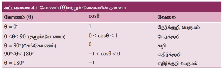 கொடுக்கப்பட்ட விசை (F) மற்றும் இடப்பெயர்ச்சி (dr) க்கு அட்டவணை 4.1 இல் தொகுத்துள்ளவாறு அவற்றிற்கிடையே உள்ள கோணம் θ ஆனது செய்யப்பட்ட வேலையின் மதிப்பை முடிவு செய்கிறது.