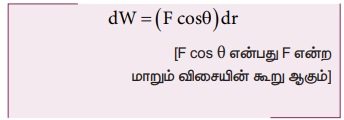 மாறுபடும் விசை (F) ஒன்றின் கூறு ஒரு பொருளின் மீது செயல்படும்போது dr என்ற சிறு இடப்பெயர்ச்சியை ஏற்படுத்த விசையினால் செய்யப்பட்ட சிறு வேலை (dW) க்கான தொடர்பு