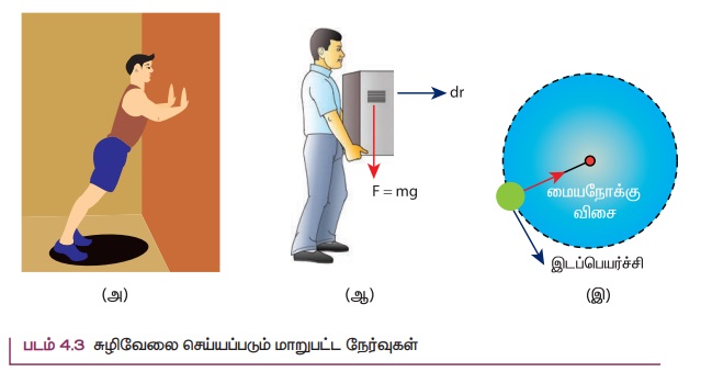 படம் 4.3 (இ) இல் காட்டியுள்ளவாறு வட்ட இயக்கத்தில் உள்ள பொருளின்மீது செயல்படும் மையநோக்கு விசையானது வேலை ஏதும் செய்யாது. ஏனெனில் அது எப்போதும் இடப்பெயர்ச்சிக்கு செங்குத்தாக உள்ளது.
