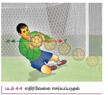 விசையினால் செய்யப்படும் எதிர்க்குறி வேலைக்குப் பல உதாரணங்கள் உள்ளன. கால்பந்து விளையாட்டில், வீரர் (Goal keeper) அவரை நோக்கி வரும் பந்தை ஒரு விசையைச் செலுத்திப் பிடிக்கிறார். அவ்விசையானது பந்தின் இயக்கத்திற்கு எதிர்திசையில் பந்து அவரது கைகளில் ஓய்வுநிலைக்கு வரும் வரை செலுத்தப்படுகிறது. படம் 4.4 இல் காட்டியுள்ளவாறு விசையைச் செலுத்தும் நேரத்தில் அவர் பந்தின்மீது எதிர்வேலை செய்கிறார். இந்தப் பாடப்பகுதியில் மேலும் பல எதிர்வேலைக்கான சூழ்நிலைகள் பற்றி கற்போம்.
