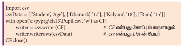 writer.writerow(row) # writerow() செயற்கூறில் தரவை ஒரு வரிசையாக கோப்பில் எழுத CF.close()