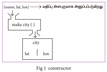 இங்கு makecity(name, lat, lon) என்ற ஆக்கி city எனும் பொருளை